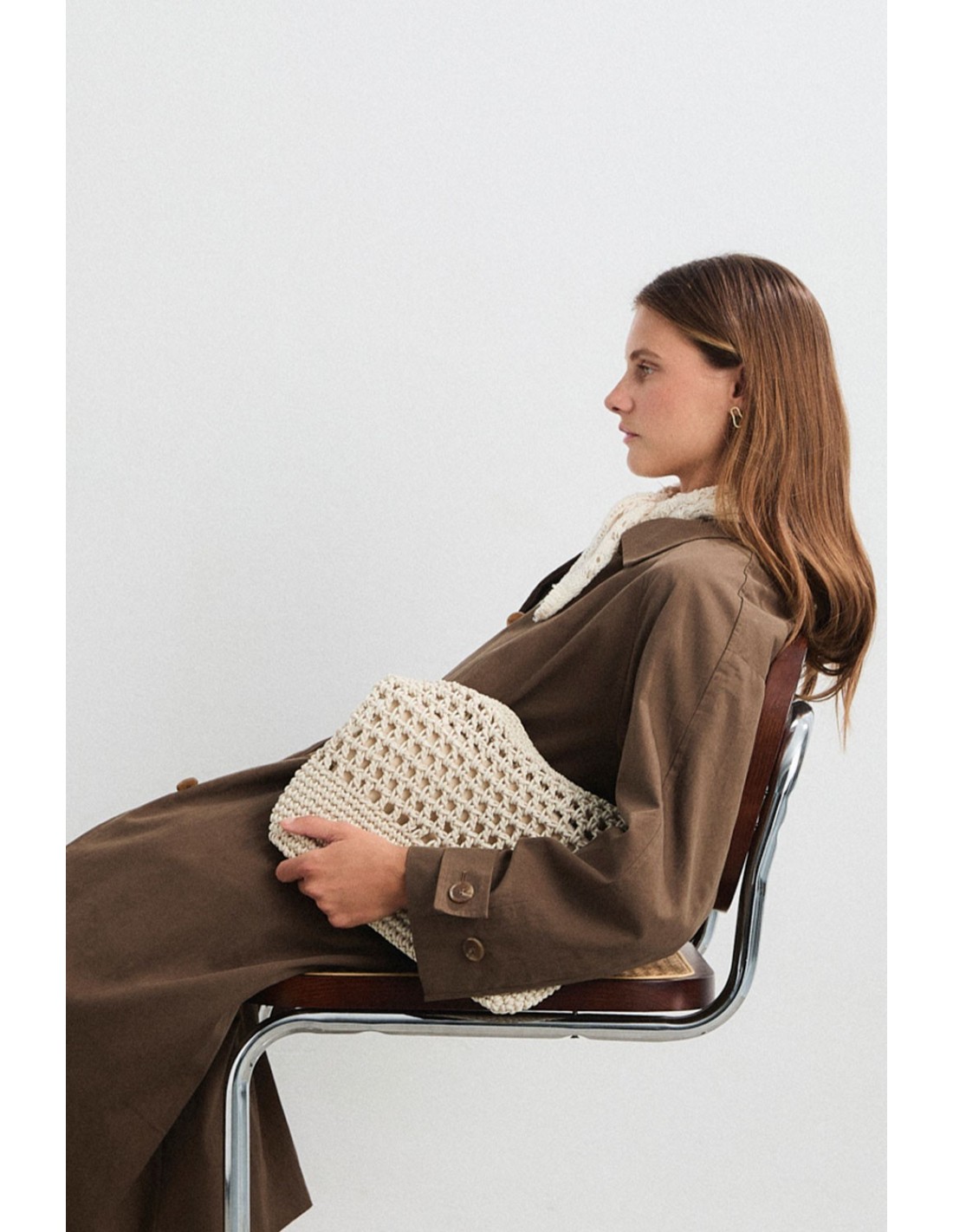 Bolso tote de crochet con asas de cuero y neceser interior con cremallera metálica.