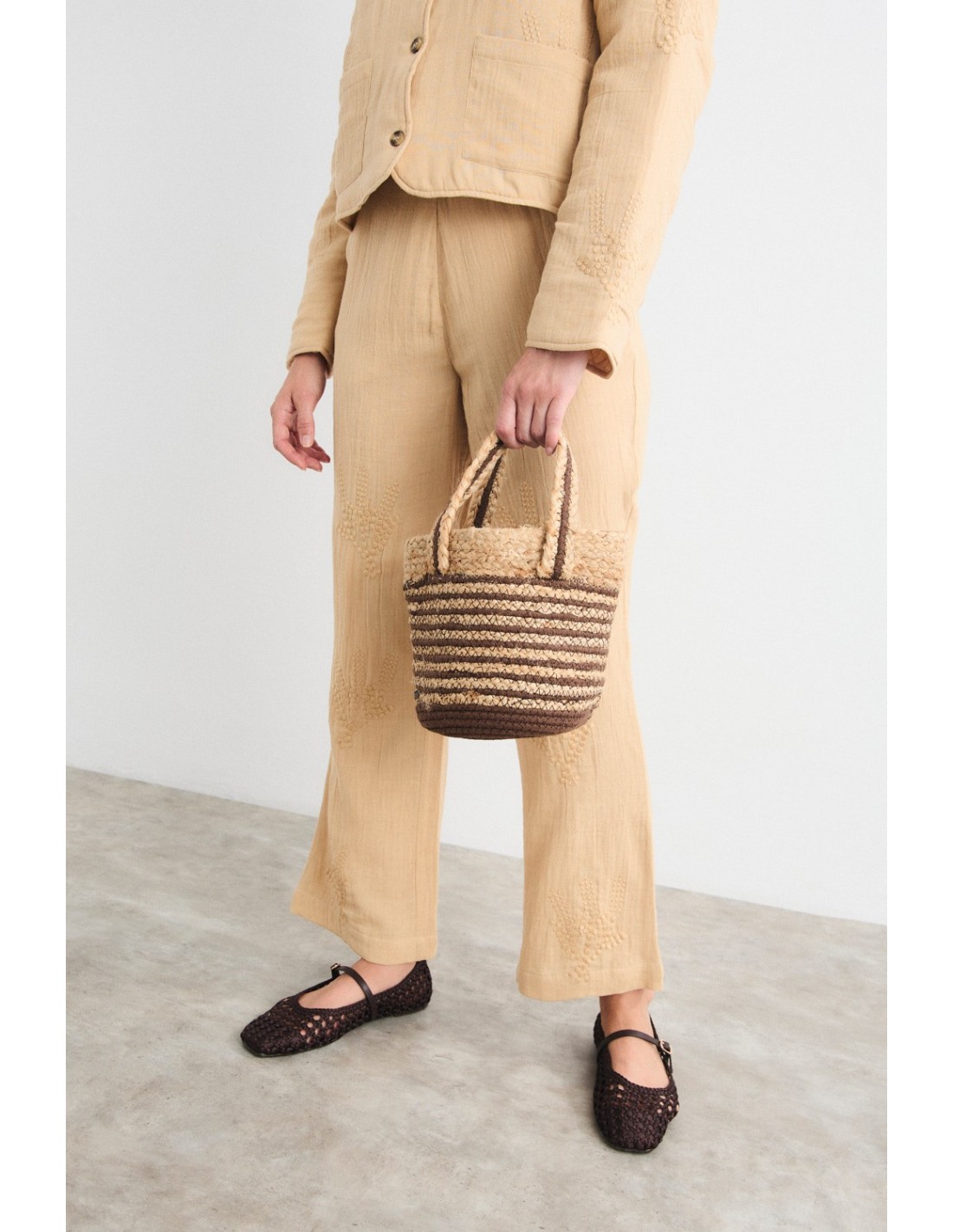 Bolso de forma ovalada confeccionado en rafia natural con franjas trenzadas horizontales en tonos marrón. Cuenta con doble asa superior en rafia a juego con ribete marrón, se puede llevar en la mano.