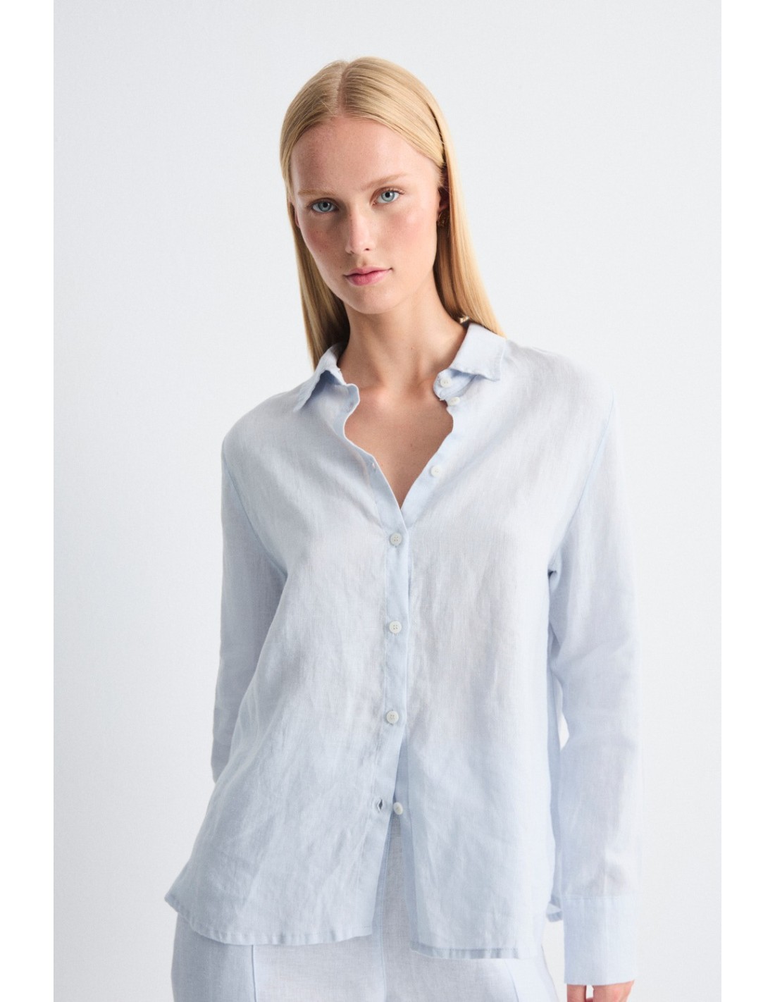 Camisa básica de lino con cuello camisero, botonadura frontal, puños con botón, canesú en la espalda y pliegue central. Incluye un botón oculto en la costura lateral que permite llevarla cruzada, ofreciendo una silueta versátil y sofisticada. Combínala con los pantalones Aurora. También disponible el vestido de lino Aurora en la misma familia.