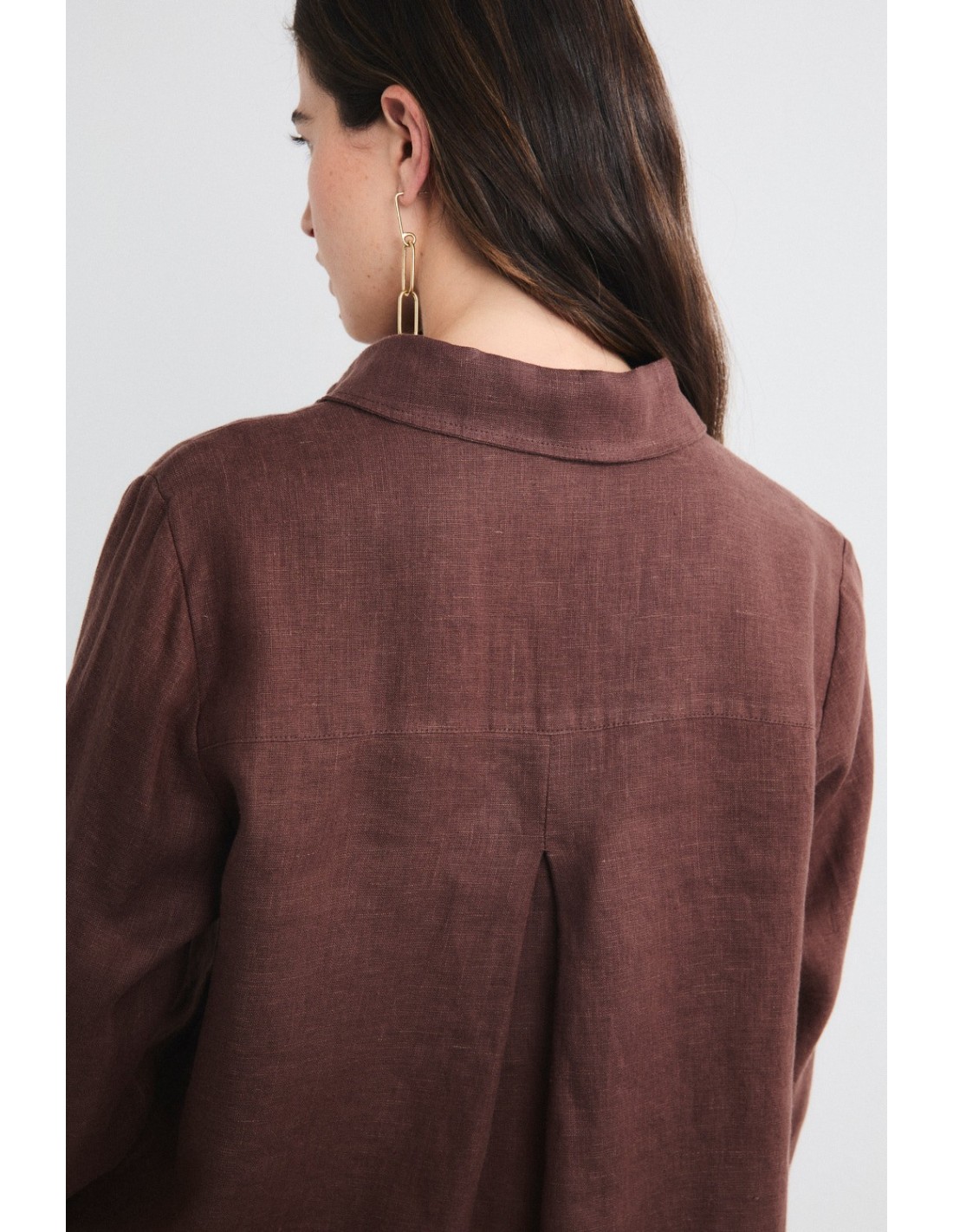 Camisa básica de lino con cuello camisero, botonadura frontal, puños con botón, canesú en la espalda y pliegue central. Incluye un botón oculto en la costura lateral que permite llevarla cruzada, ofreciendo una silueta versátil y sofisticada. Combínala con los pantalones Aurora. También disponible el vestido de lino Aurora en la misma familia.