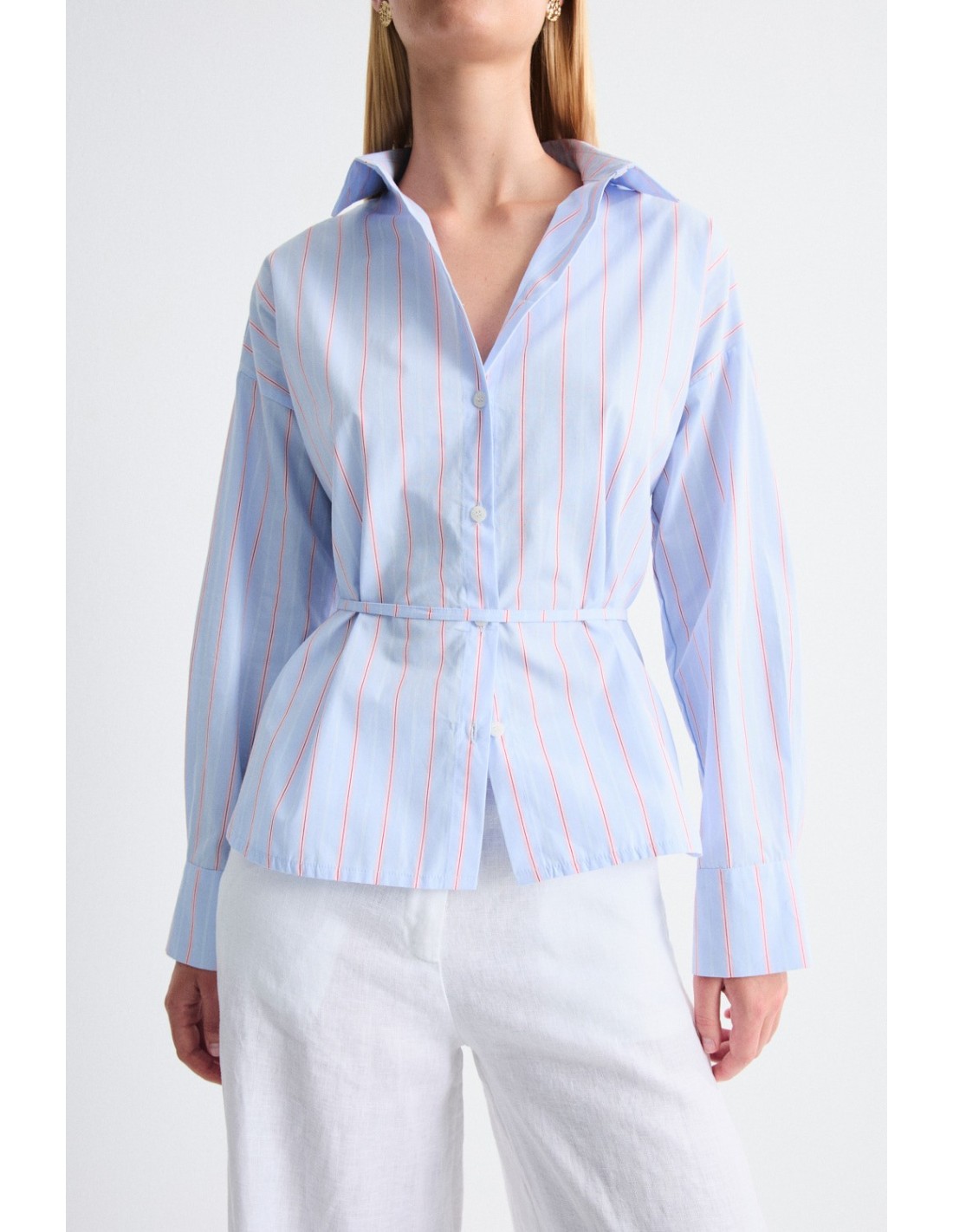 Camisa oversize de rayas con bajos redondeados, manga larga y detalle de tira en la espalda con trabillas, que permite ajustar la cintura o llevarla a modo de cinturón. Combínala con los shorts Icaro para un total look con un toque moderno.