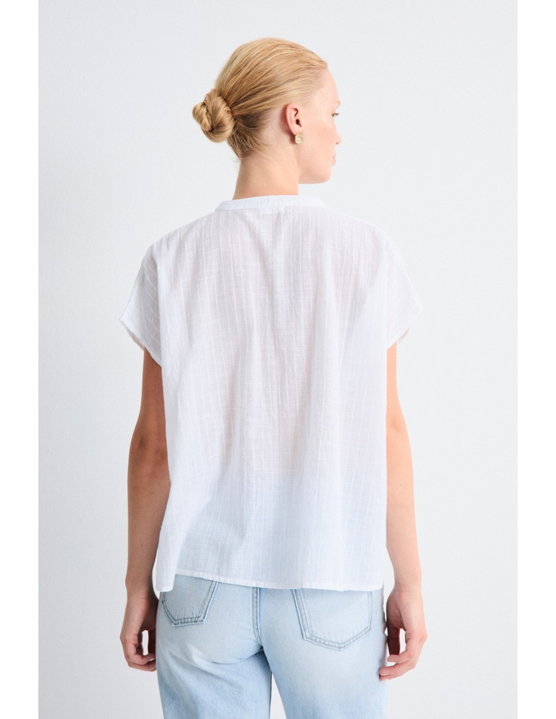 Blusa de cuello mao, corte amplio y escote en pico, con botonadura central y aberturas laterales que aportan fluidez al movimiento. Forma parte de la misma familia que el vestido Sare.