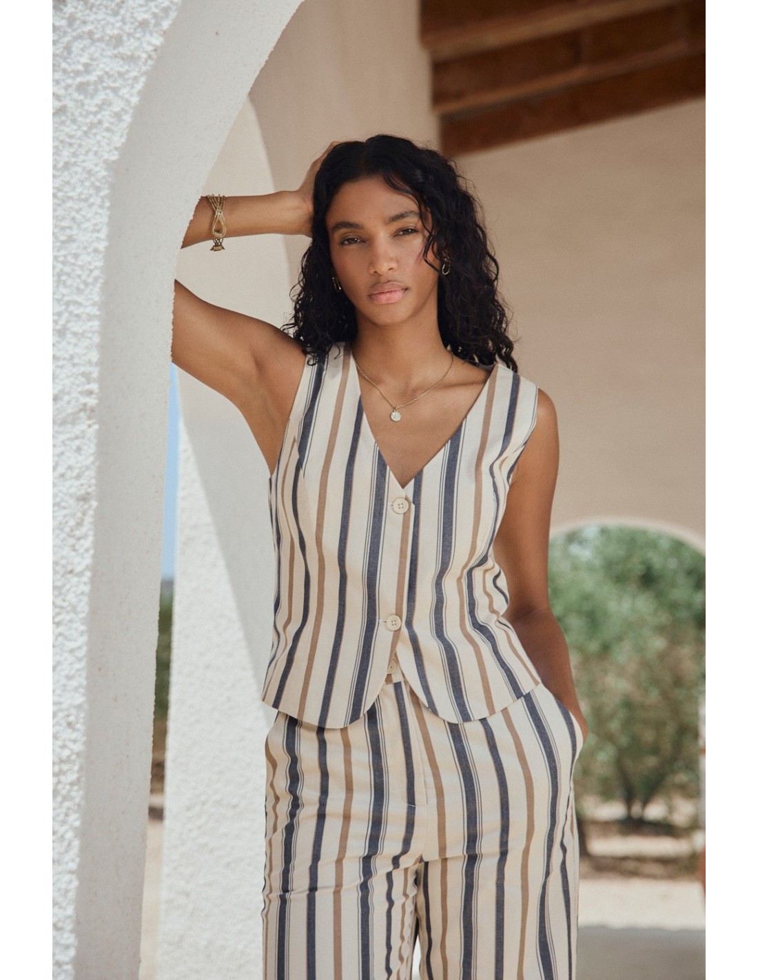 Chaleco de rayas con forro interior y cierre de doble botonadura frontal. Combínalo con el pantalón Helios para un total look elegante y a la vez moderno.