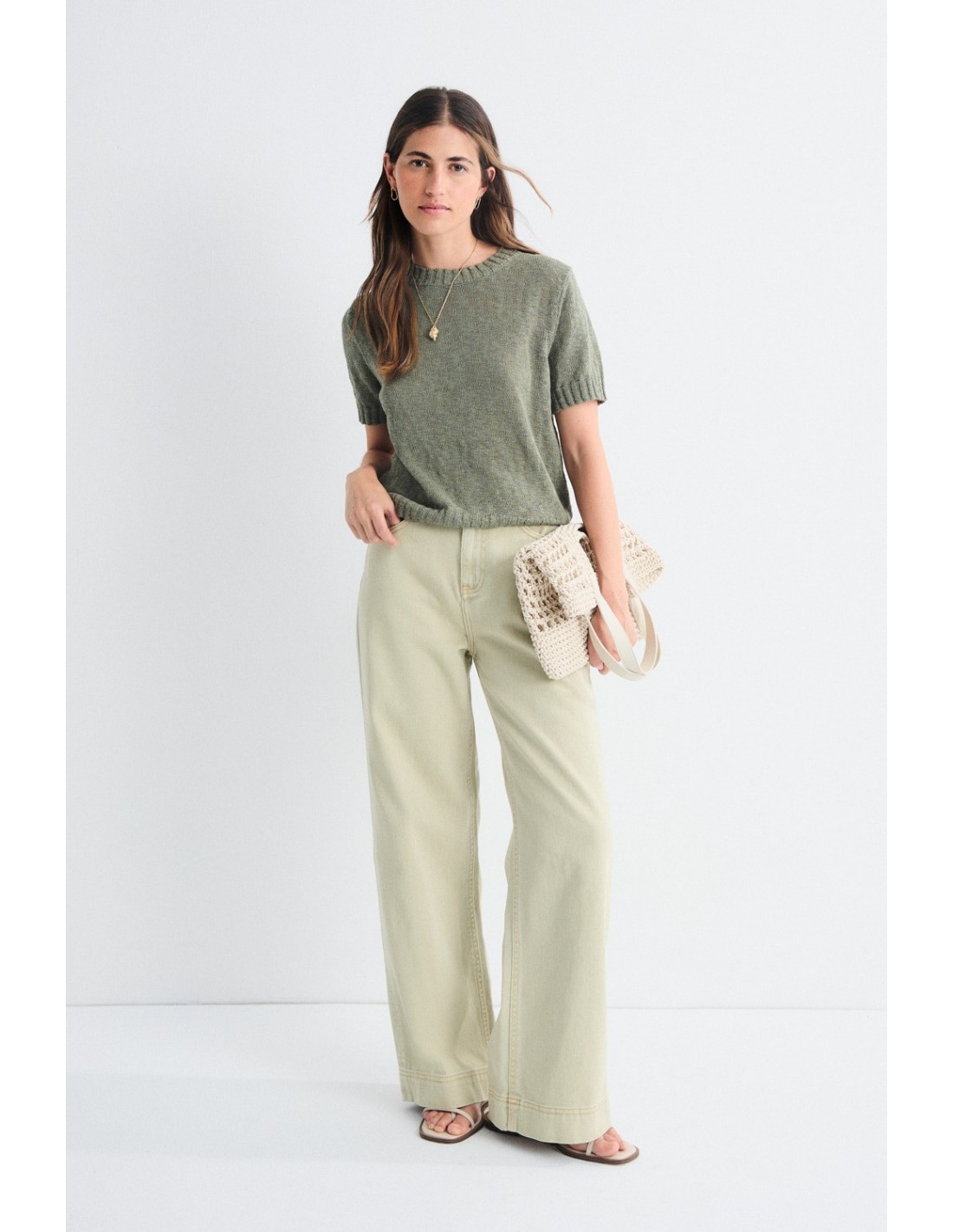 Jersey de punto con manga corta y acabados de canalé en cuello, puños y bajo. Pertenece a la familia Balam, junto al top y el jersey del mismo hilo.