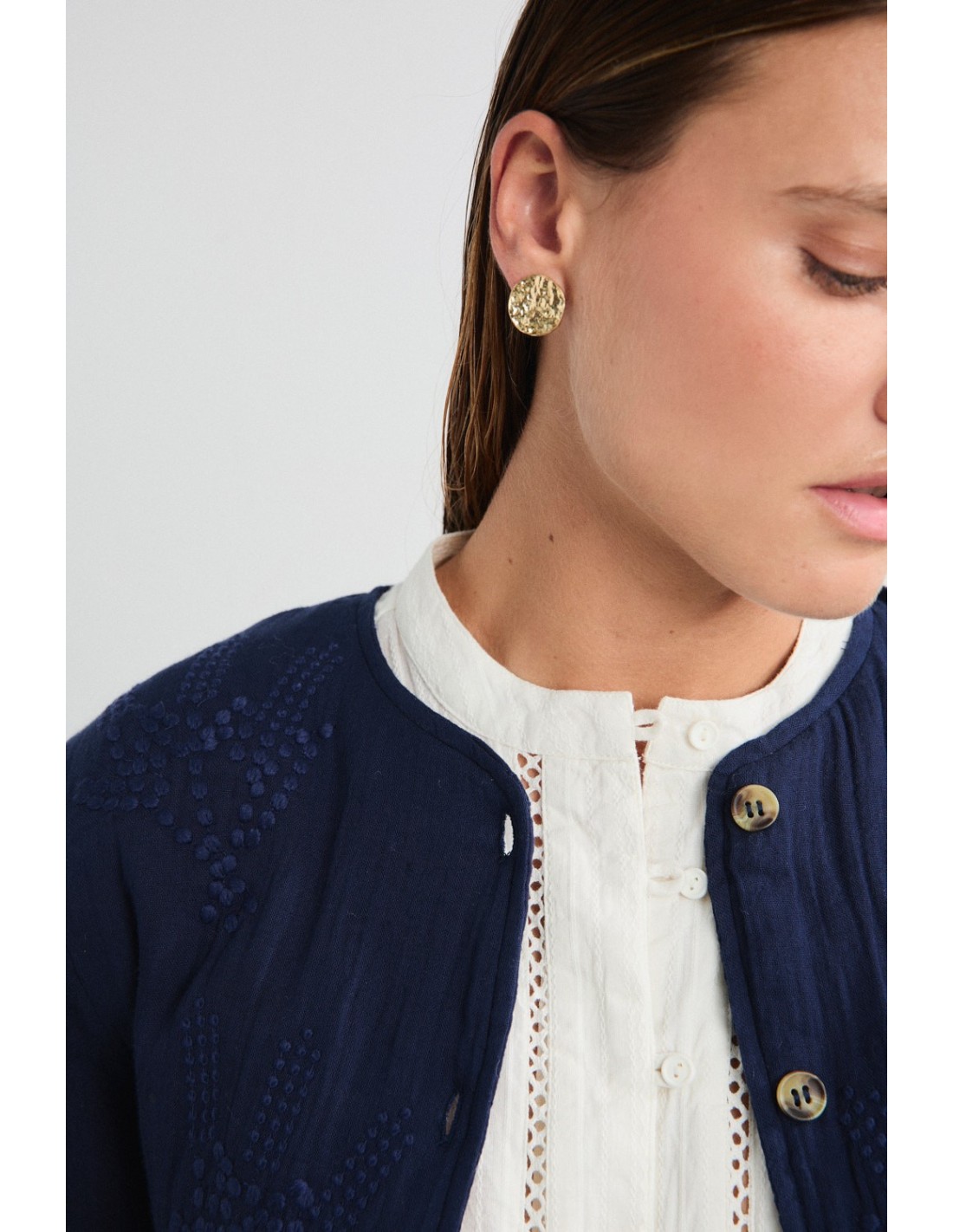 Chaqueta acolchada con bordados delicados, tapeta frontal con botones, bolsillos y manga larga. Un diseño con aire romántico y funcional que aporta textura y calidez. Forma parte de la família del chaleco y pantalones Altan.