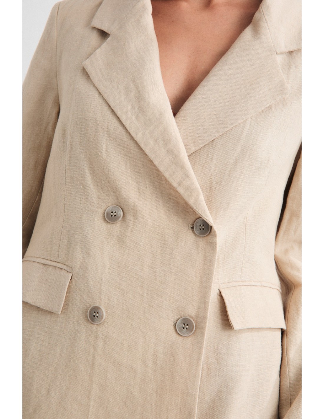 Americana de lino con hombreras, cuello de solapa y cierre frontal con cuatro botones. Puños con botones y dos bolsillos de parche que aportan un aire relajado. Combínala con el pantalón Akira para un total look sofisticado en climas cálidos.