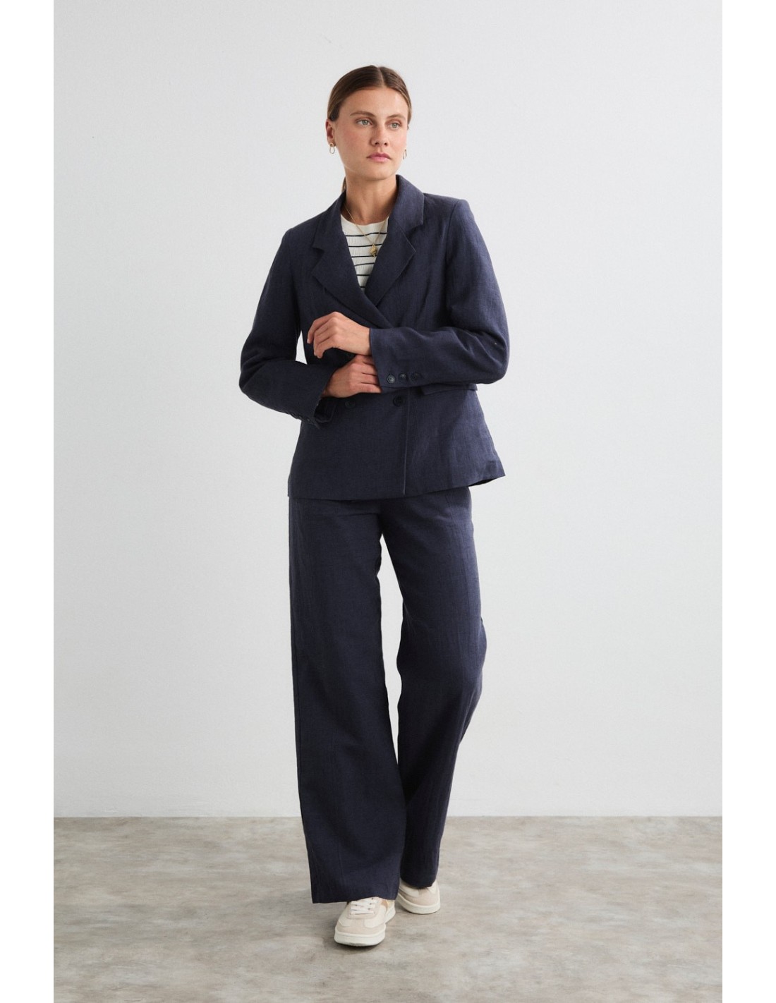 Americana de lino con hombreras, cuello de solapa y cierre frontal con cuatro botones. Puños con botones y dos bolsillos de parche que aportan un aire relajado. Combínala con el pantalón Akira para un total look sofisticado en climas cálidos.