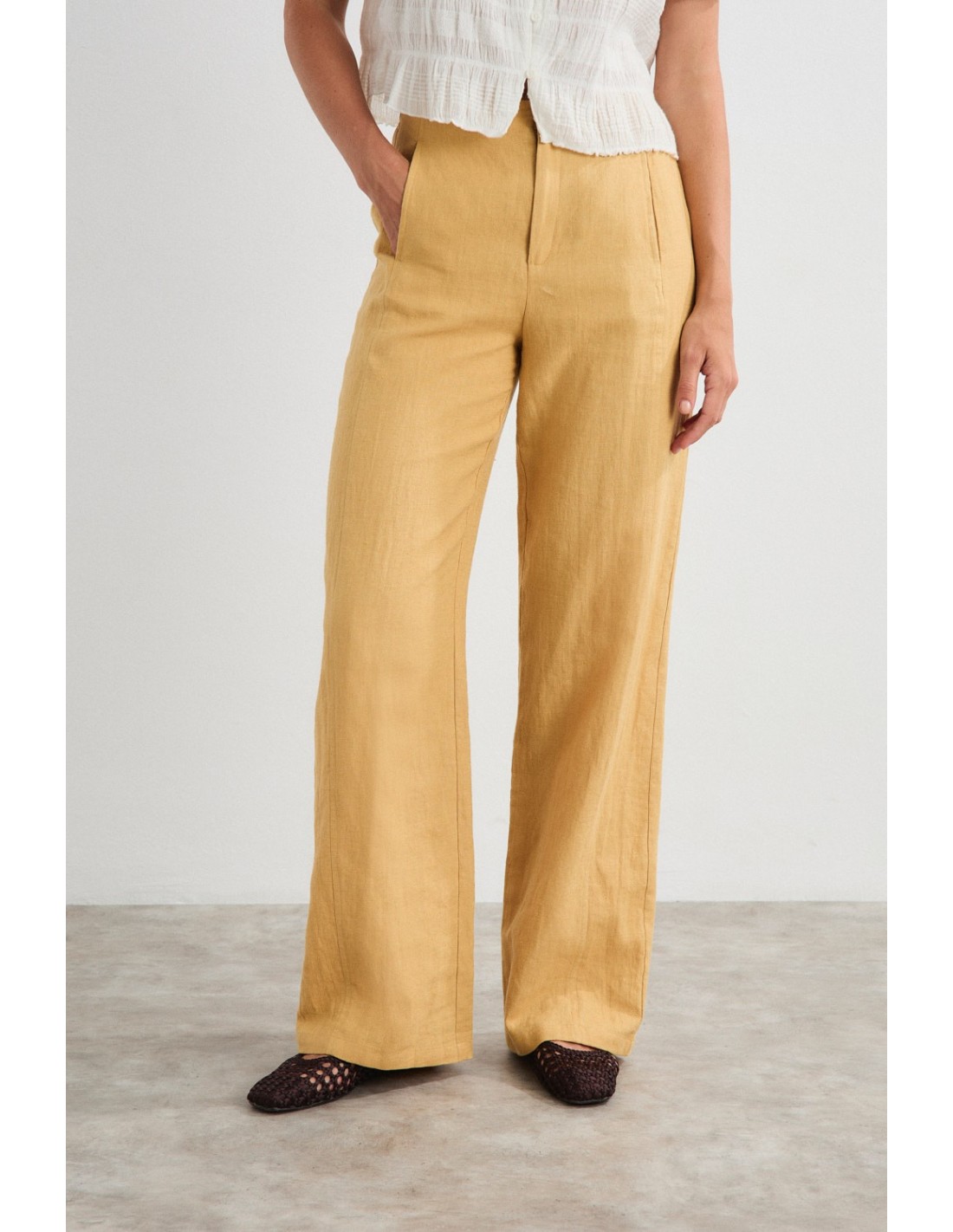 Pantalón recto y amplio, con doble costura lateral y bolsillos en costura. Cierre mediante cremallera y botón, con cintura elástica en la parte trasera. Combínalo con la americana Akira para un total look sofisticado e ideal para climas cálidos.