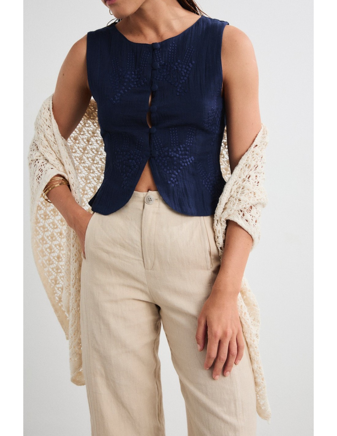 Châle tricotée ajourée. Un accessoire qui rehausse n'importe quel look lors d'une occasion spéciale. Découvrez également l'écharpe Pastor.