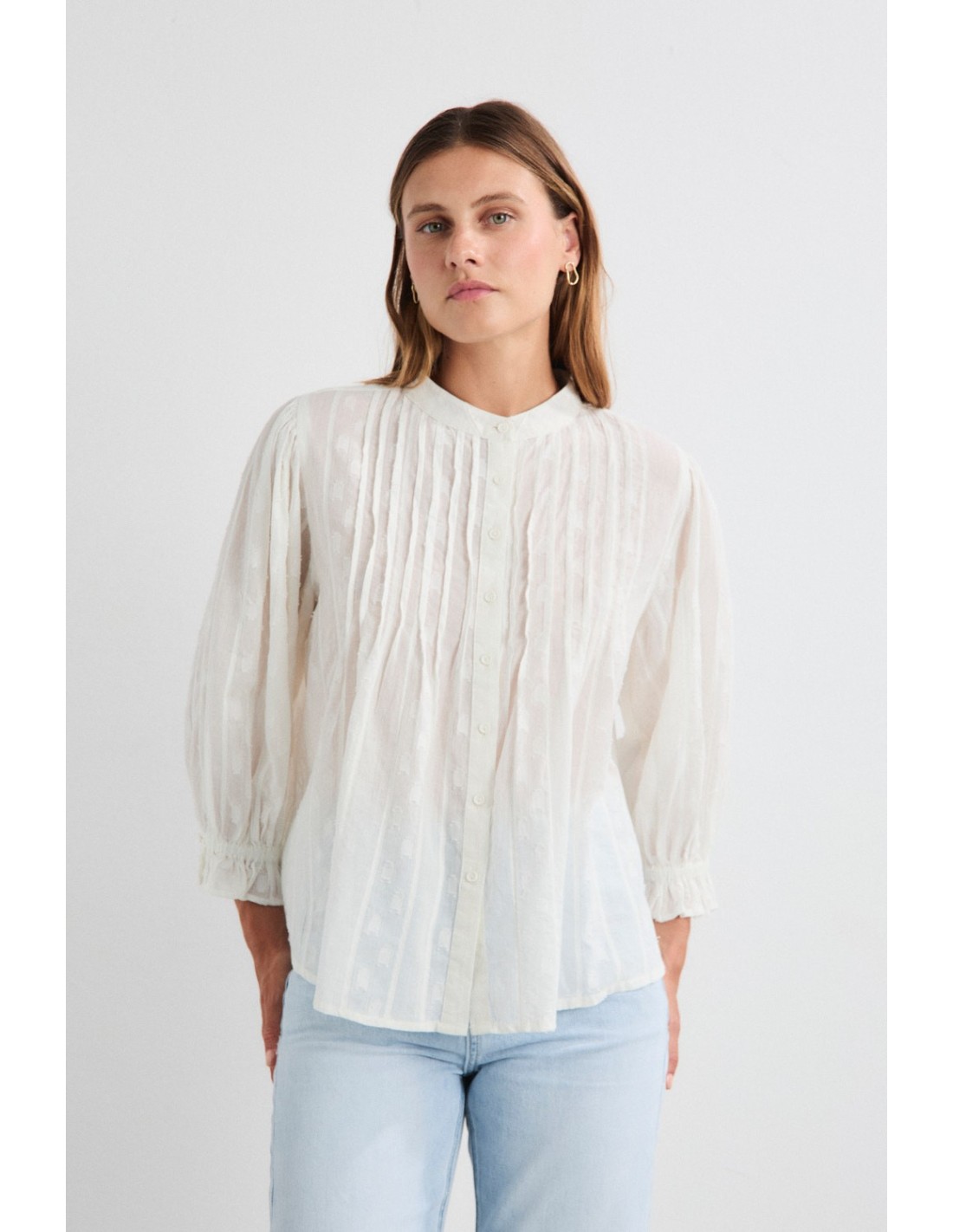 Blouse romantique à manches trois-quarts, col mao, patte de boutonnage sur le devant, manches bouffantes et mini-volant délicat sur le bord de la manche pour une touche romantique et légère.