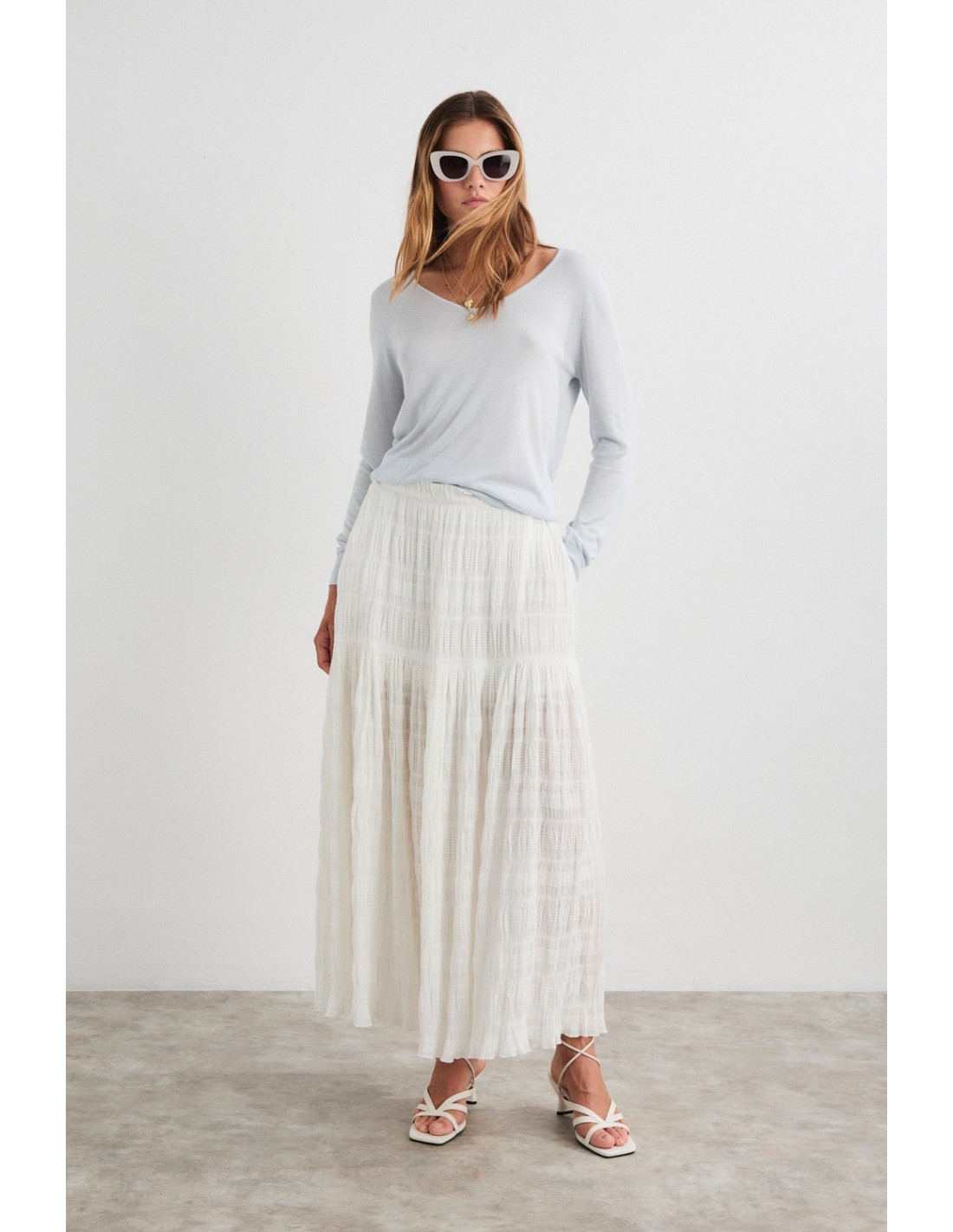 Pull basique à col en V et finition côtelée, conçu pour accompagner tout look de saison grâce à sa douceur. Il fait partie de la famille Yakira, tout comme le cardigan et le top dans le même fil.