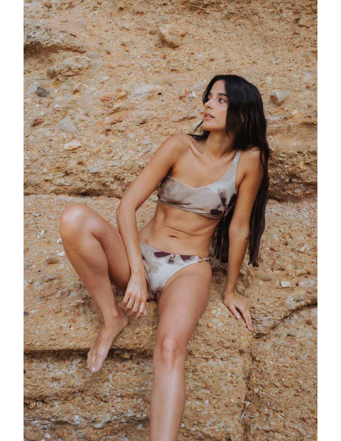 Bikini asymétrique avec de larges bretelles sur le côté gauche pour un maintien confortable. Encolure avec sangle intérieure en silicone pour un maintien optimal. Les bas de bikini ont une double bretelle sur le côté gauche de la ceinture. Le matériel est anti-allergique, sans nickel et sans composants oxydants.