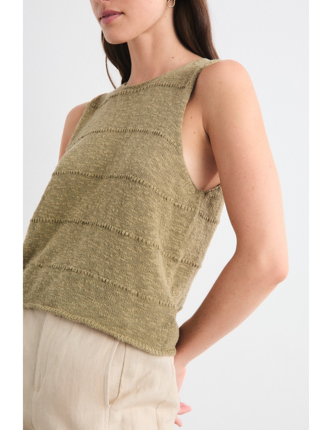 Top en tricot fantaisie à encolure ronde et sans manches. Un vêtement léger et délicat qui fait partie de la famille Nunavut, avec le pull et le kimono tricotés dans le même fil.