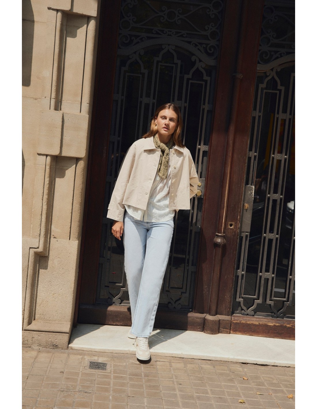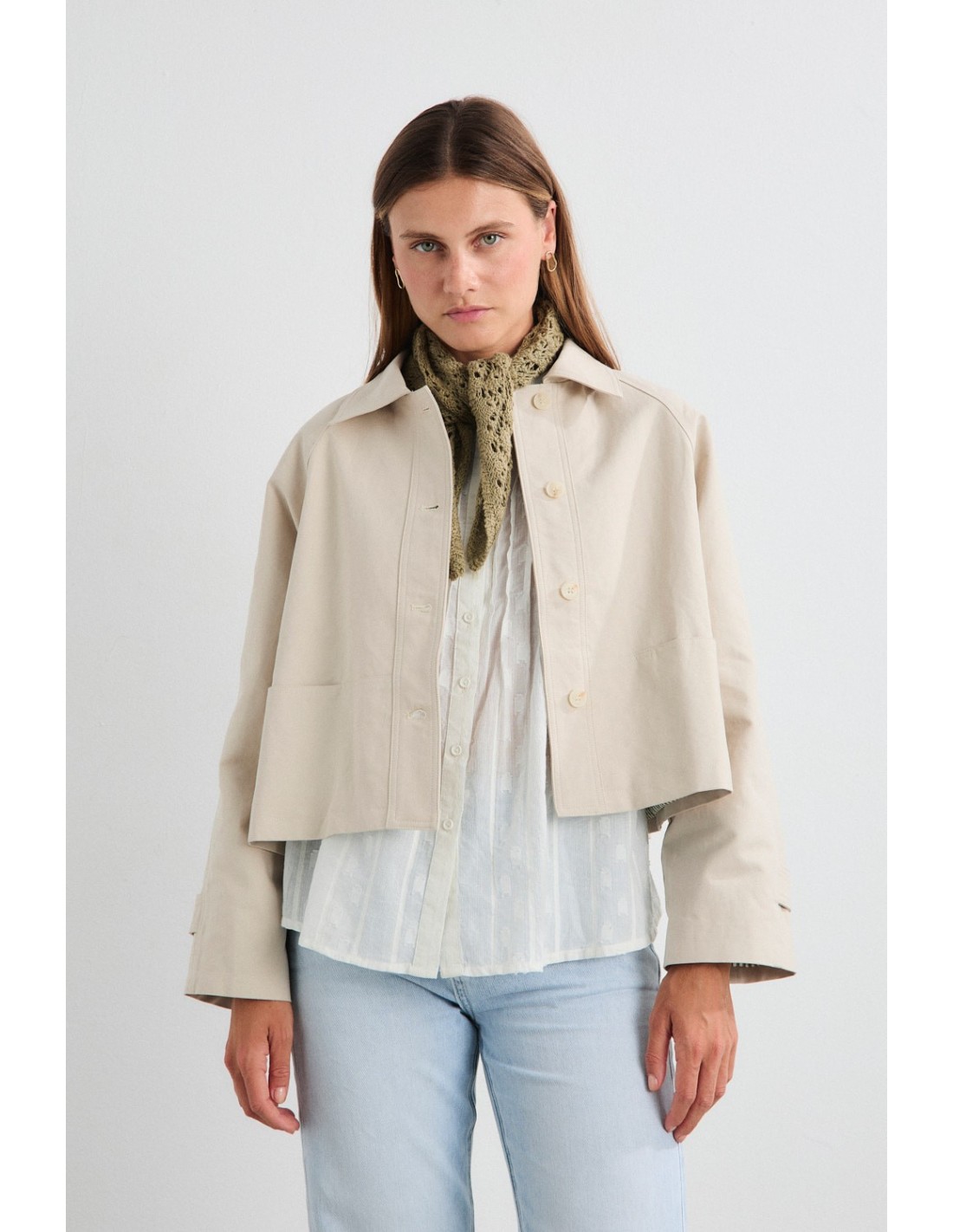 Trench court et ample avec manches raglan, fermeture à bouton sur le devant et poches sur le devant. Détails rayés sur la doublure intérieure. La silhouette A-line modernise le trench classique en lui donnant une touche plus contemporaine.