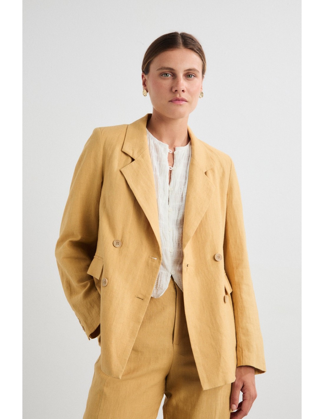 Blazer en lin avec épaulettes, col à revers et fermeture à quatre boutons sur le devant. Les poignets boutonnés et les deux poches plaquées ajoutent une touche de décontraction. Associez-le au pantalon Akira pour un look total sophistiqué sous des climats plus chauds.
