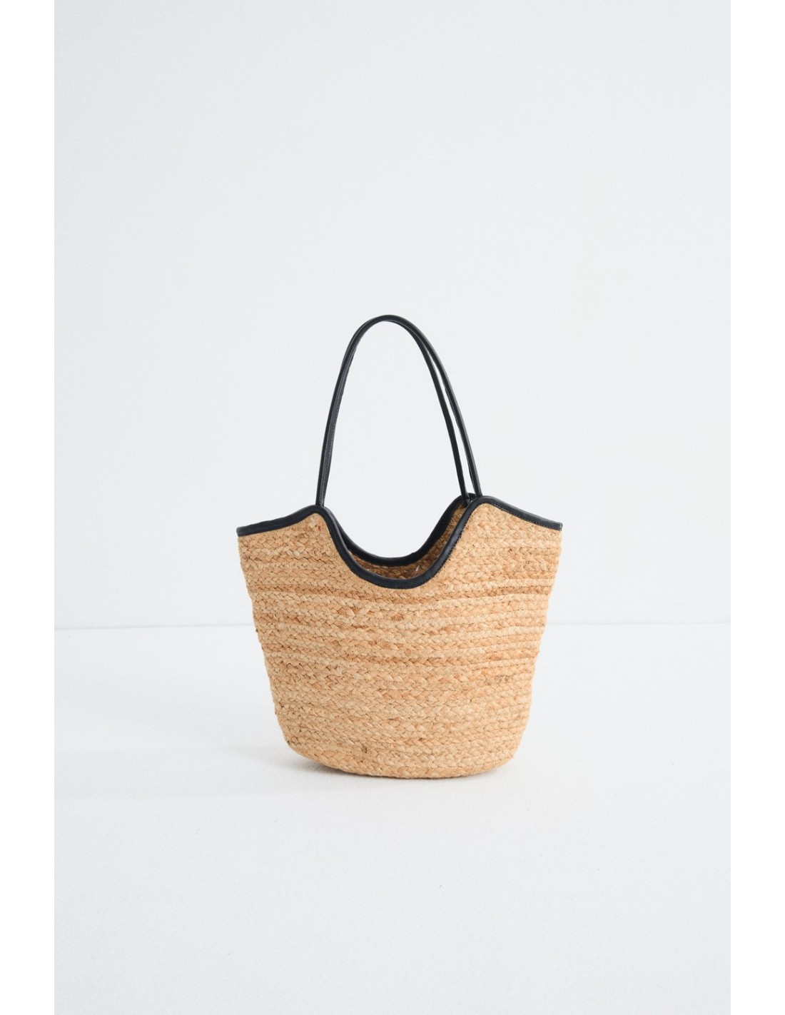 Natural raffia bag with contrasting black leather handles, long enough to carry comfortably over the shoulder.