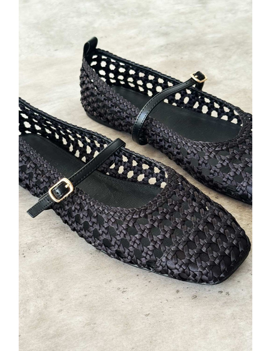 Openwork ballerina with a thin leather strap and golden metal buckle. Mus&Bombon logo engraved on the heel insole.