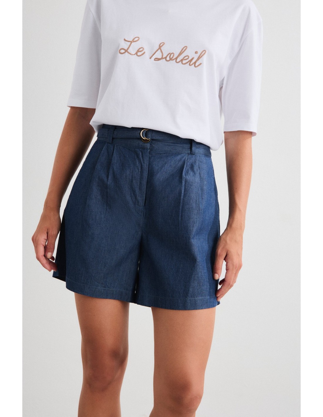 High-waisted Bermuda shorts with elasticated waistband, two diagonal front pockets and two back pockets with flap. Wide leg and two darts on the front. Combine them with the Banten shirt for a total look ideal for city days. Also available in long trousers.