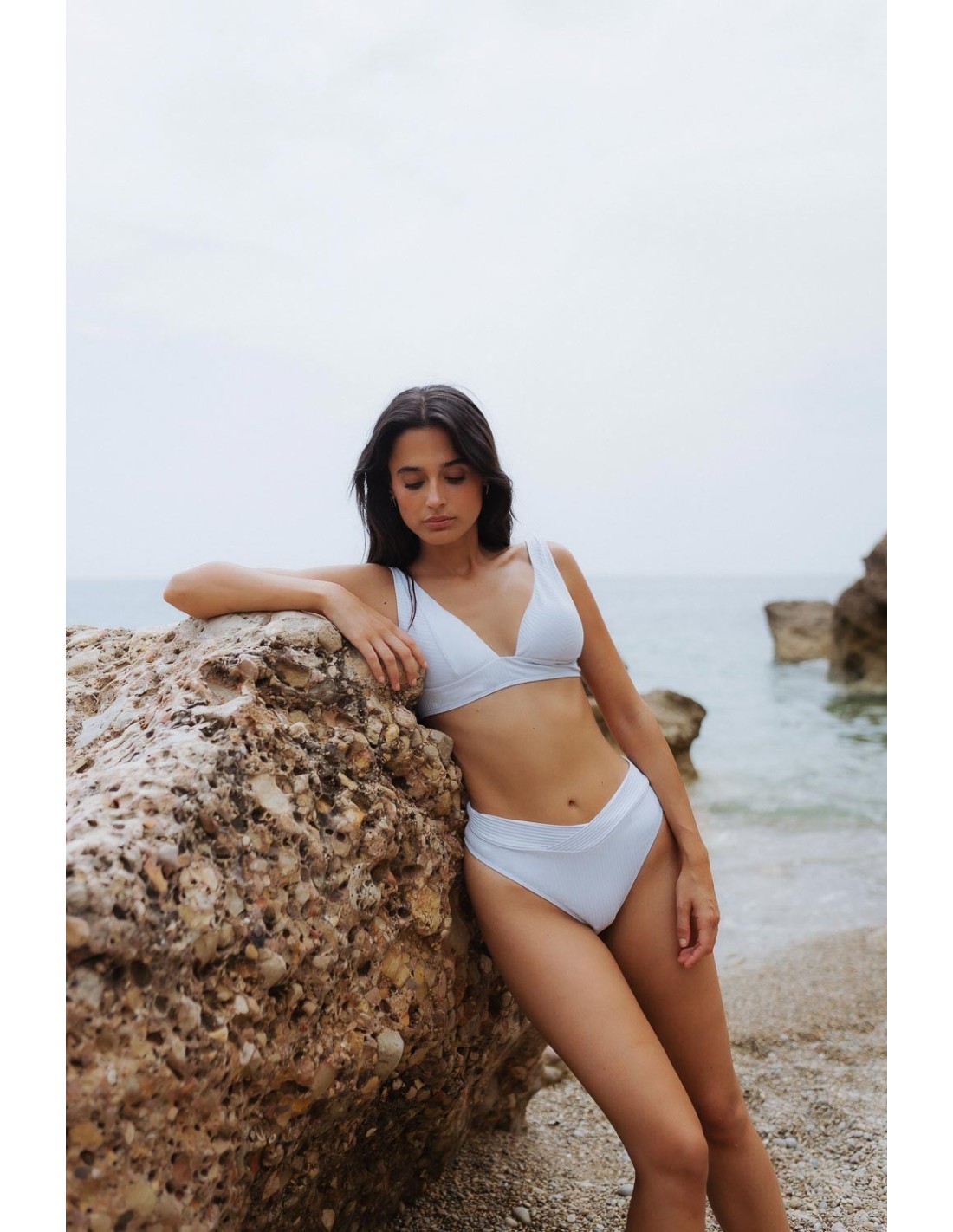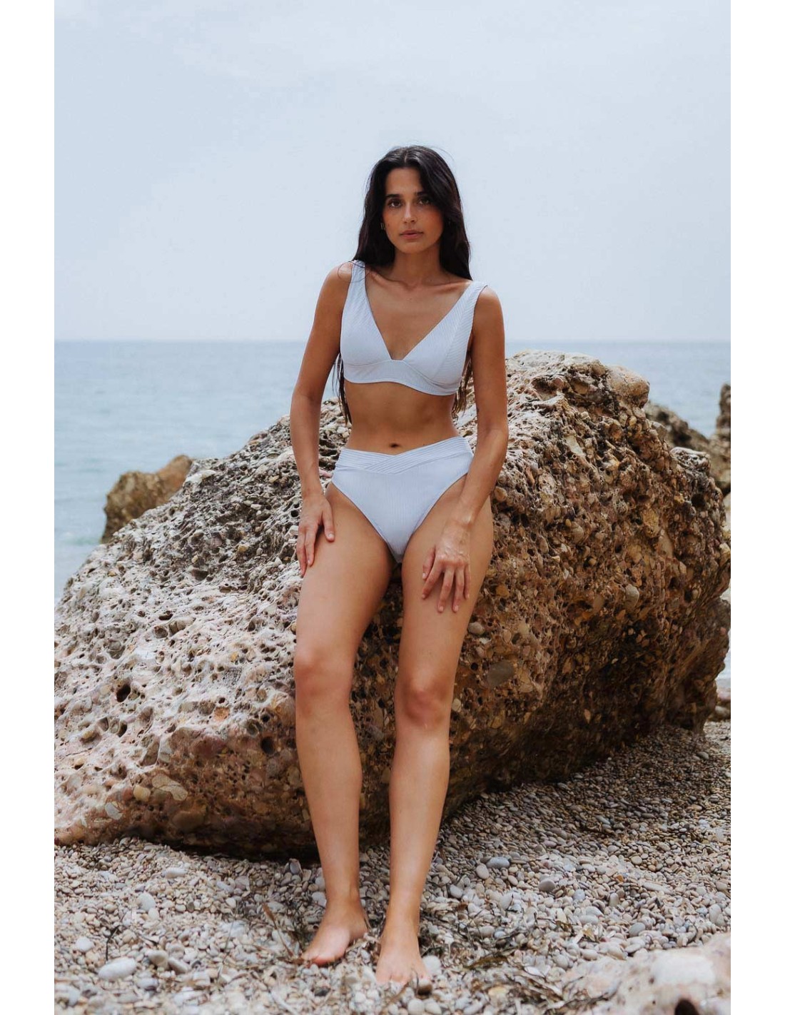 Bikini top with a V-neckline, wide straps and an underbust piece that ties at the back. Briefs with crossed waistband at the front for a slimming visual effect. It comes with openings with removable foam.The model is wearing size S.