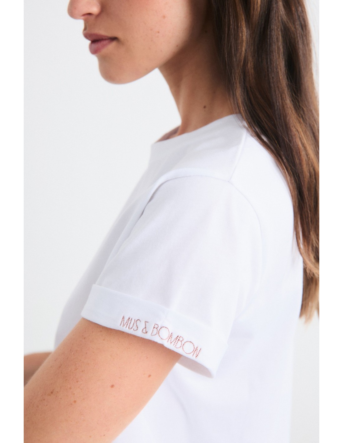 Musbom is aT-shirt with a crew neck, double turn-up sleeve cuffs and embroidered print on the left sleeve. The Mus&Bombon wardrobe staple that must be in your wardrobe.
