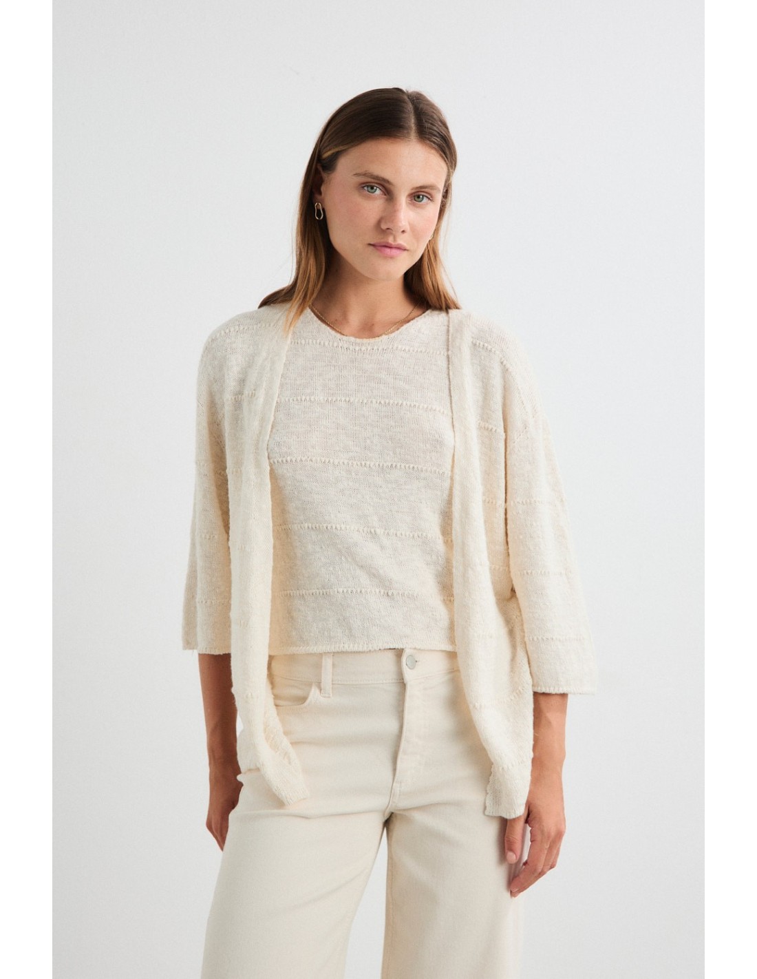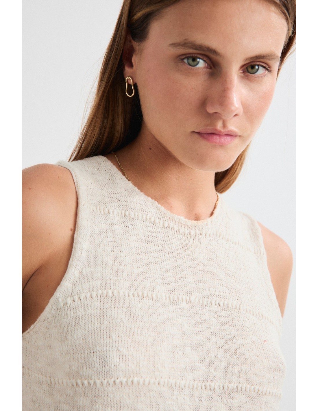 Fancy knitted top with round neckline and sleeveless. A light and delicate garment that is part of the Nunavut family, along with the jumper and the kimono knitted in the same yarn.