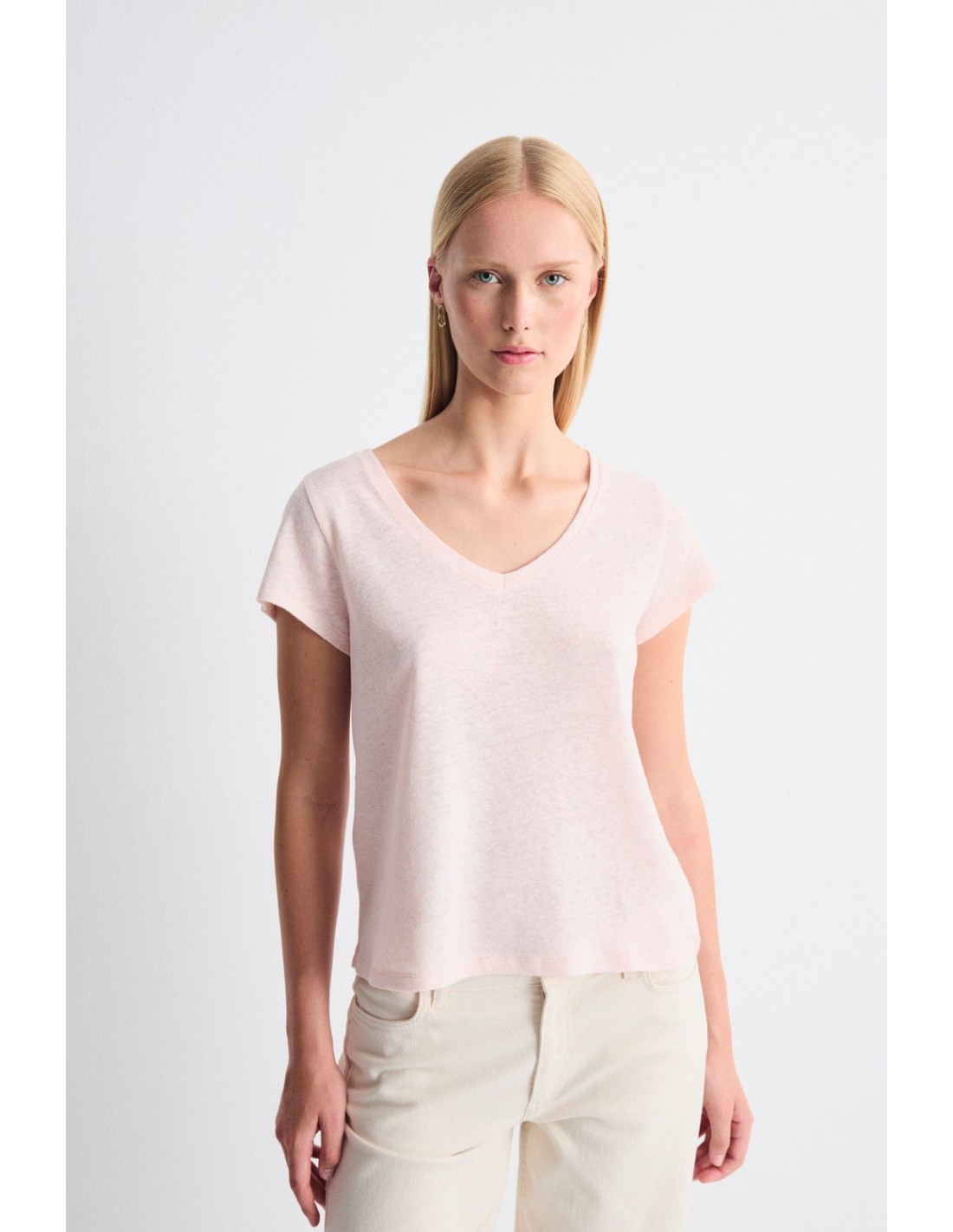 Linen T-shirt with V-neck and short sleeves. A fresh and versatile garment that belongs to the Luzara family, along with the sleeveless version and the top in the same fabric.