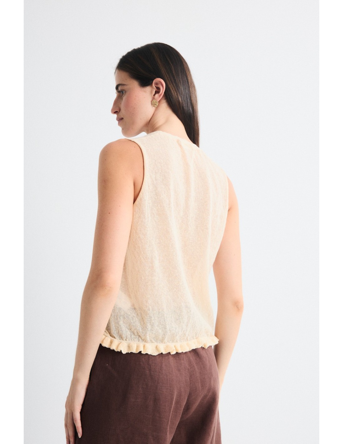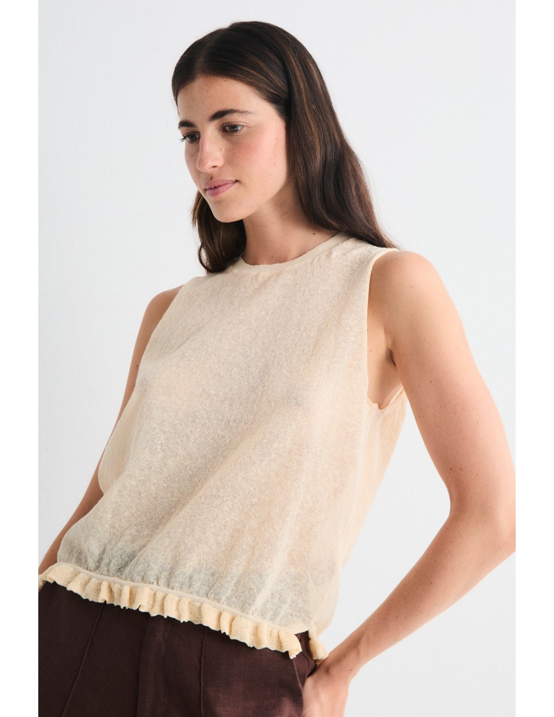 Tricot top with mini ruffle at the hem and ribbed crew neck. Combine it with the Mirri cardigan for a modern and romantic total look.