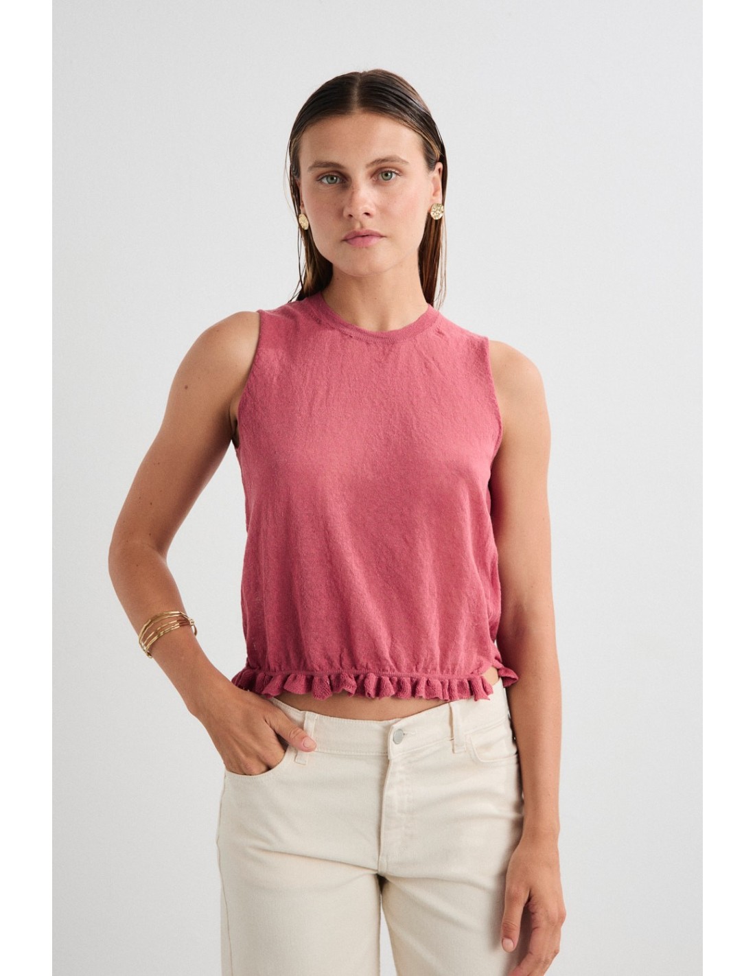 Tricot top with mini ruffle at the hem and ribbed crew neck. Combine it with the Mirri cardigan for a modern and romantic total look.