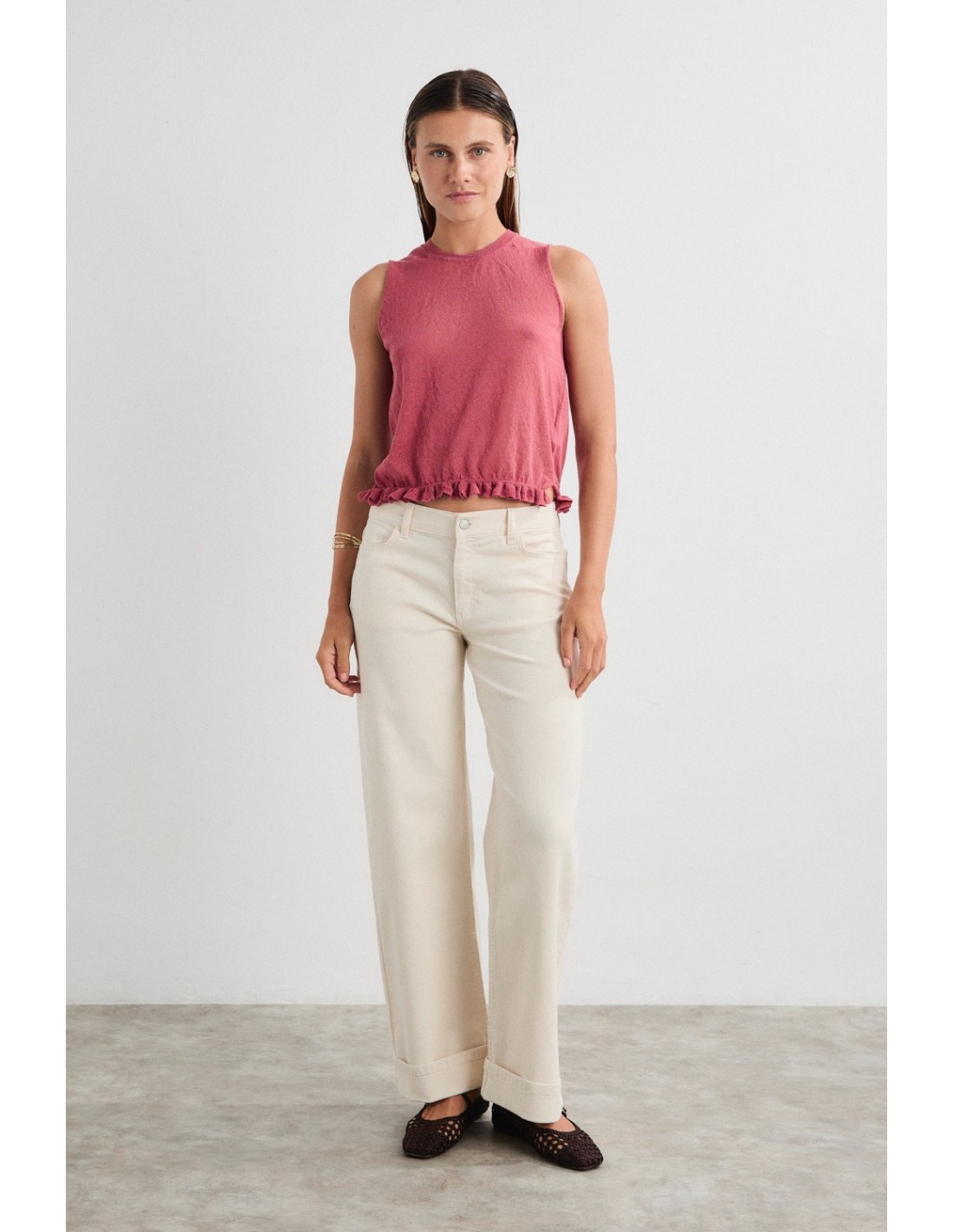 Low rise twill pants with wide leg and turn-up hem detail, classic pockets and five belt loops.