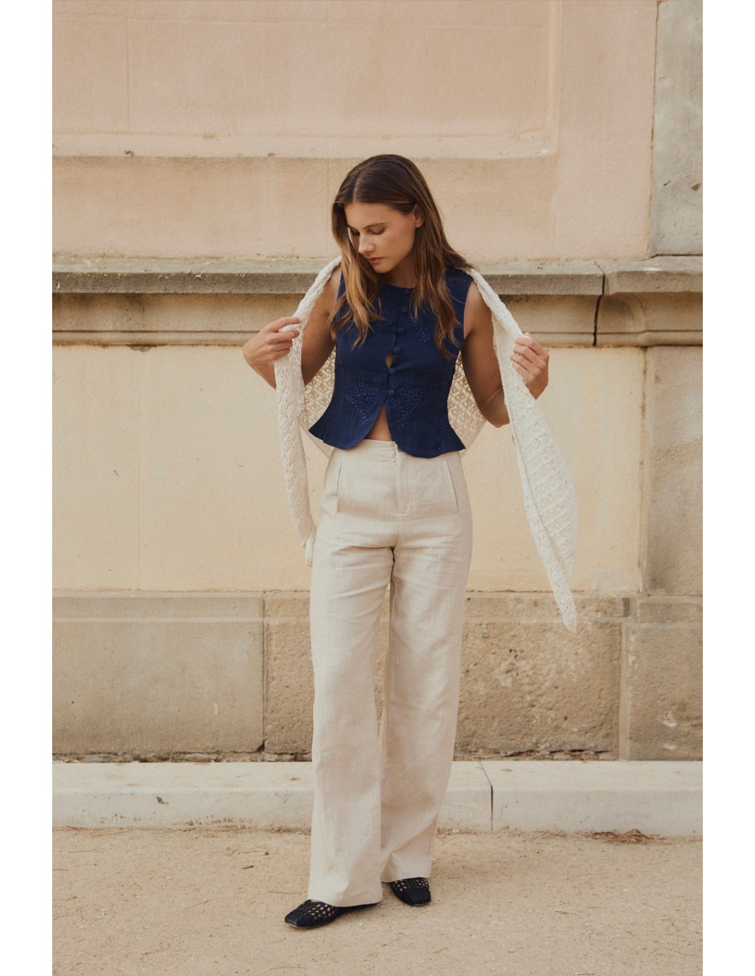 Straight and wide trousers, with double side seams and in-seam pockets. Zip and button fastening, with elasticated waistband at the back. Pair with the Akira blazer for a sophisticated total look ideal for warmer climates.